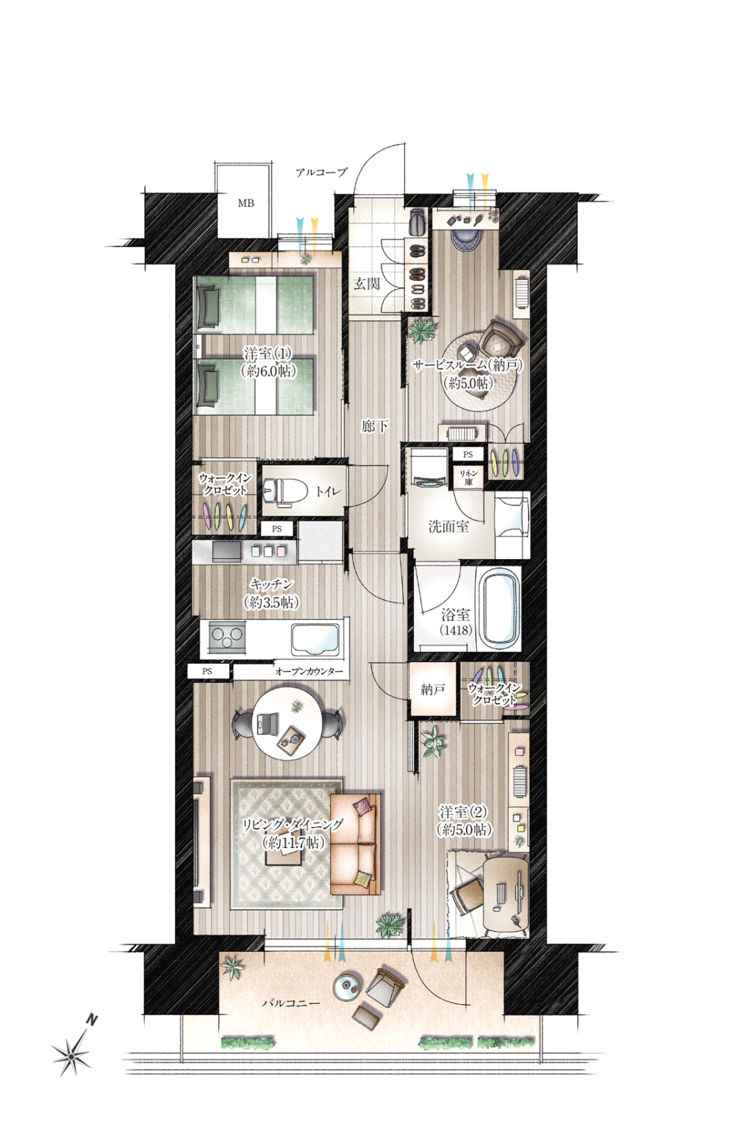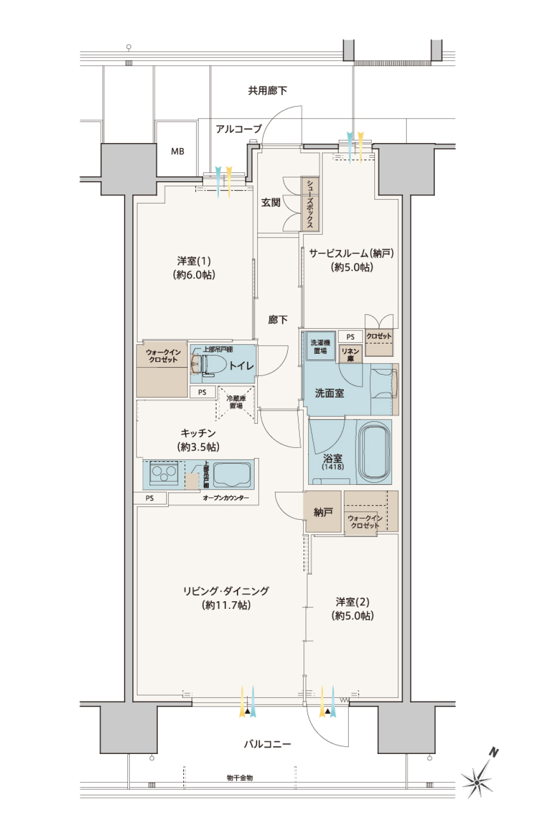 S:サービスルーム(納戸)、N:納戸、WIC:ウォークインクロゼット